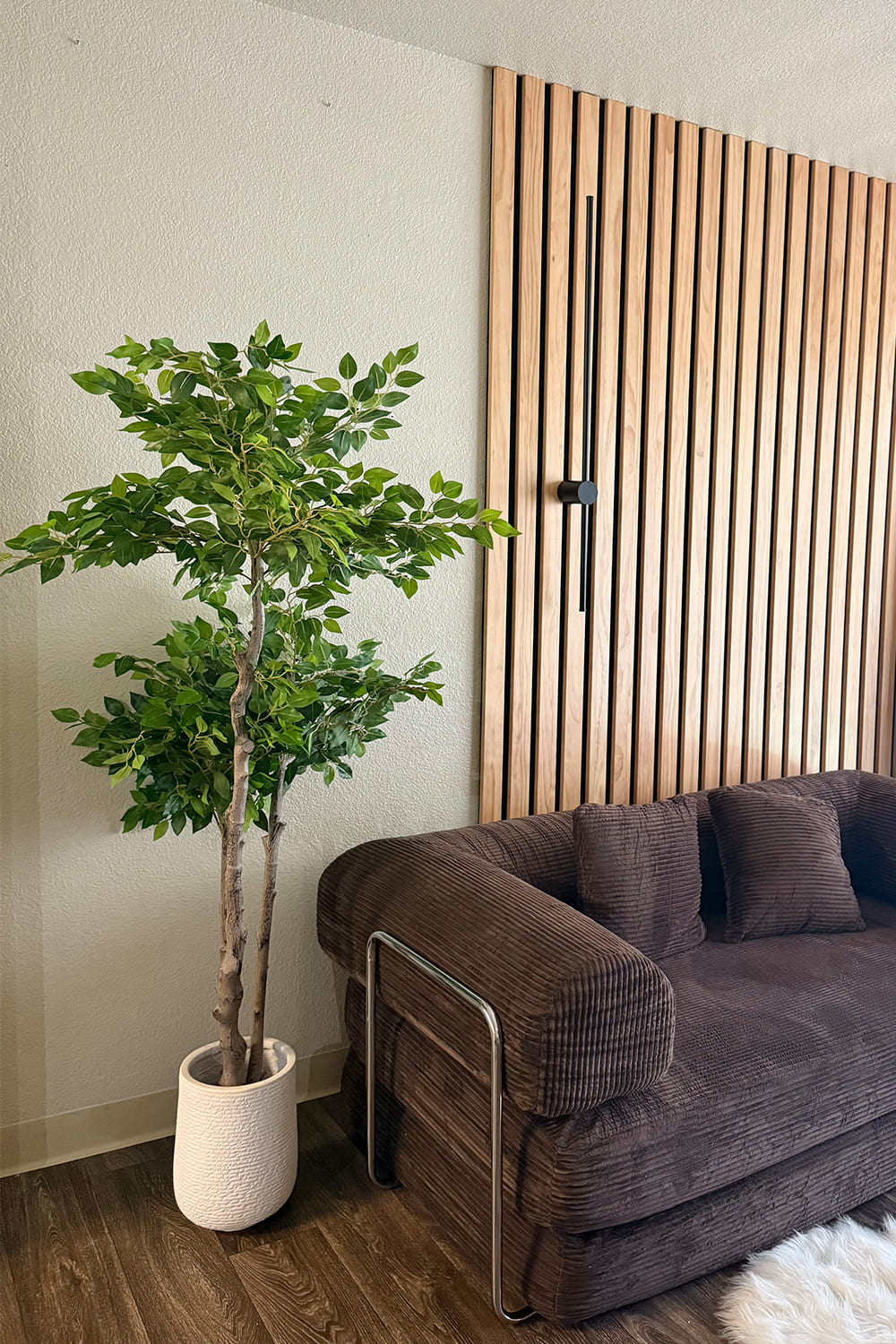 This 6ft artificial ficus tree instantly brings life and freshness into any room 🌿 I love how realistic it looks – no watering, no mess, just pure greenery. The white pot gives it a clean and modern vibe, making it perfect for living rooms, bedrooms, or even an office corner. Such an easy way to add that cozy, natural touch to your space!